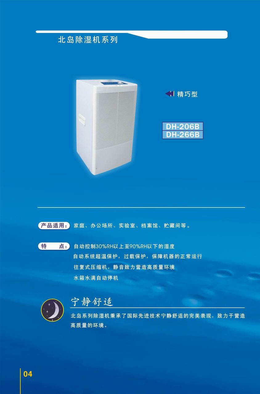产品适用:家庭、办公场所、实验室、档案馆、贮藏间等。 特 点: 自动系统超温保护,过载保护,保障机器的正常运行 往复式压缩机,静音致力营造高质量环境 水箱水满自动停机。 宁静舒适: 北岛系列除湿机秉承了国际先进技术宁静舒适的完美表现,致力于营造高质量的环境。 清新空气健康家:高效防霉过滤网,易拆洗,有效吸附尘埃、烟气、消除异味,保证室内 空气新鲜洁净,让家人更健康。